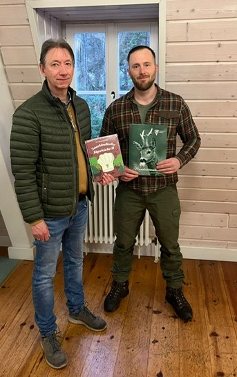 Foto: Schulleiter Dr. Bernhard Feichtner (links) überreicht Herrn Letzelter ein Wildkochbuch für seine außerordentlichen Prüfungsergebnisse.